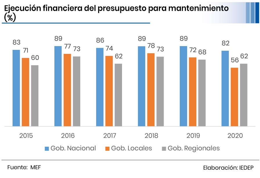 En ese contexto, será importante que se dote a las entidades del gobierno subnacional de capacidades para que ejecuten el presupuesto que se les asignará, más aún si se tiene en cuenta que durante el periodo 2015-2020 la ejecución del gasto en mantenimiento de los gobiernos locales alcanzó en promedio el 71,4%, de los gobiernos regionales el 66,5%, en ambos casos muy por debajo del 86,4% logrado por el Gobierno Nacional.