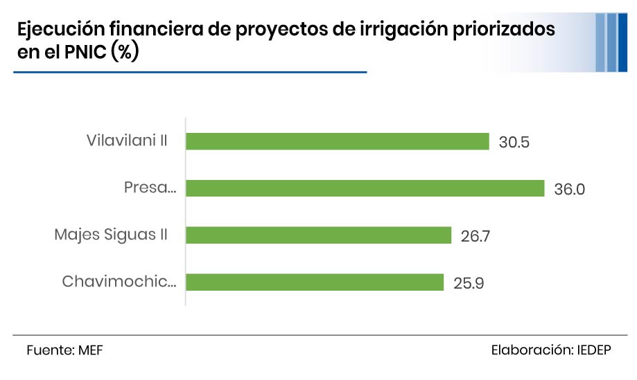 Según el Ministerio de Economía y Finanzas (MEF), de estos cuatro proyectos, tres están fuera de plazo por problemas sociales (Vilavilani II), necesidad y conveniencia de realizar modificaciones contractuales (Majes Siguas II) y necesidad de fijar el reinicio de obras (Chavimochic III). El proyecto restante aún está en etapa de proceso y presenta demoras en la elaboración de documentos técnicos para la ejecución del saldo de obra (Presa Ancascocha).