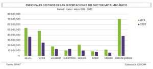 Los principales países de destino son los Estados Unidos, Chile, Ecuador, Colombia, Bolivia, Brasil y México, quienes representan el 75% de los destinos de las exportaciones totales peruanas del sector metalmecánico.