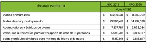 Las principales líneas de productos más afectados fueron vidrios enmarcados, partes de maquinaria pesada, acumuladores eléctricos de plomo, automóviles para el transporte de más de 16 personas y bolas y artículos similares para molinos de hierro o acero.
