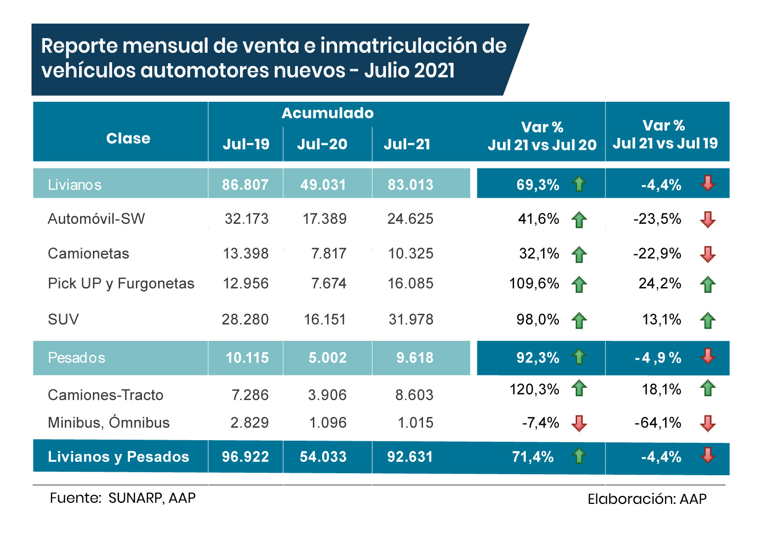De acuerdo a los segmentos de mercado, la AAP destaca que, en lo que va del año, los vehículos livianos han rebotado de manera importante y muestran un mayor crecimiento las SUV, pick up, furgonetas y todoterreno. Principalmente porque se usan para actividades productivas como minería, construcción y agricultura, e incluso para el delivery.