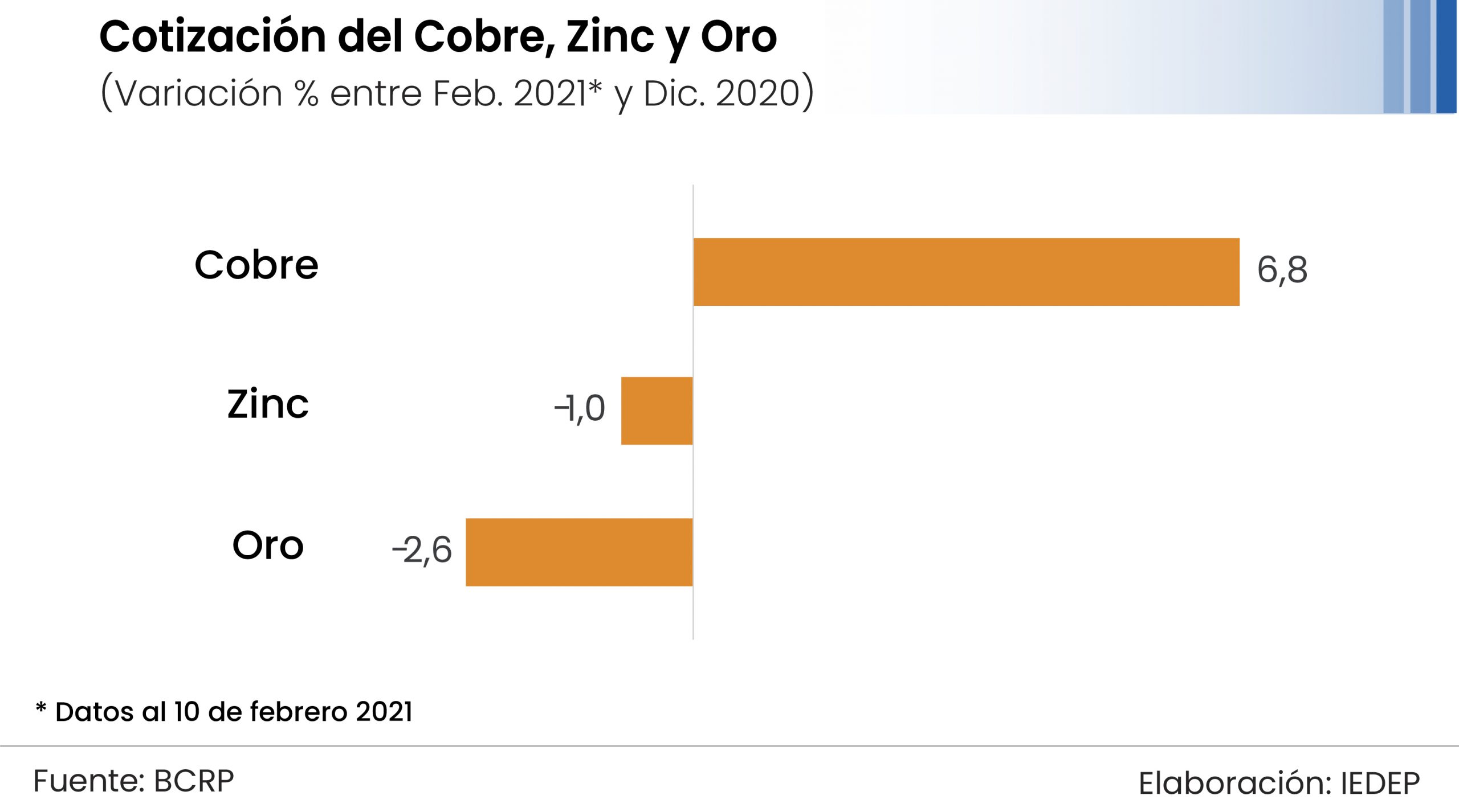 Desde enero del 2020, la cotización del cobre mostró una clara tendencia alcista, partiendo de US$ 2,55 por libra el 29 de enero 2020 hasta llegar a US$ 3,76 por libra el 10 de febrero 2021, alcanzando un crecimiento de 47,5%. Según el Banco Central de Reserva del Perú (BCRP), la principal causa de este incremento es la mayor demanda proveniente de China que representa el 50% del consumo mundial.