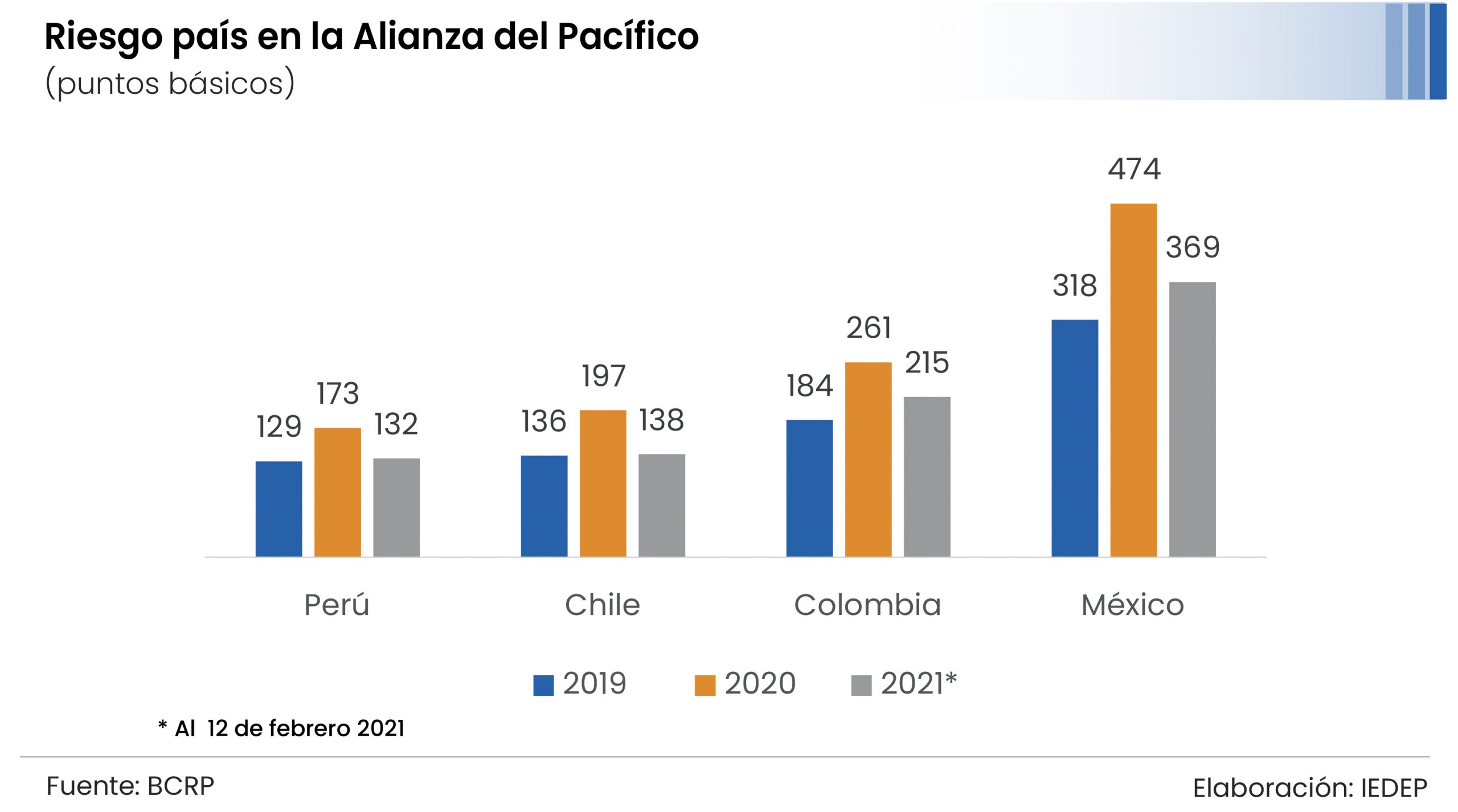 No obstante, el riesgo país fue disminuyendo gradualmente hasta posicionar al país por segundo año consecutivo como el de menor riesgo de la región con 173 puntos básicos. Al 12 de febrero, el riesgo país de Perú es el más bajo de la región con un promedio de 132. Chile tiene 138, Colombia, 215; Brasil, 262; México, 369; y Argentina, 1.430.