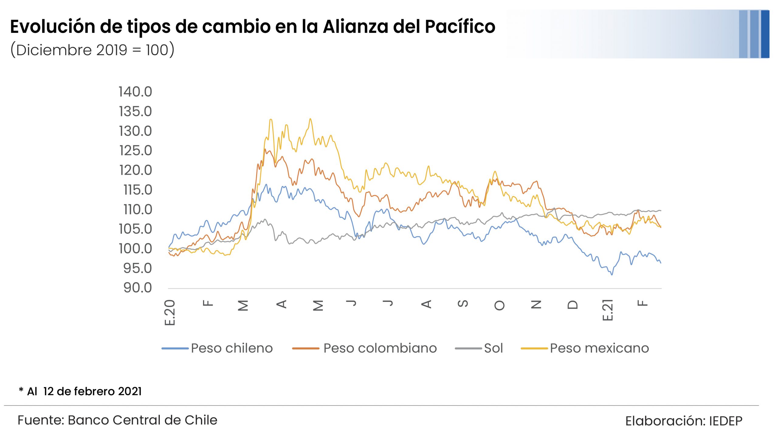 En lo que va de 2021 (hasta la quincena de febrero) continúan las presiones alcistas en los tipos de cambio de la región sudamericana que, con excepción de México y Paraguay, han visto depreciar sus monedas. En el caso del gigante de la región, el real brasileño acumuló una depreciación de 3,7%, el peso chileno 1,8%, el peso uruguayo 1,4% y el peso colombiano 0,8%.
